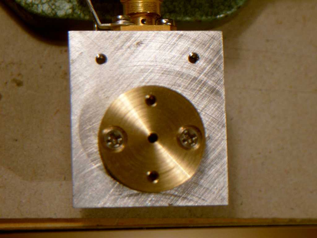 Bild 2 zeigt einen Ausschnitt vom Messaufbau, wobei zur relativen Outputanzeige beim Optimieren ein selbstgebauter HL-Koaxübergang für 76 GHz verwendet wird, etwas anderes habe ich leider nicht! Die M2-Schraube im "Kurzschlussblock" kann erst mit angeschraubtem Spiegel über Feldstärkemessungen in freier Natur richtig optimiert werden.