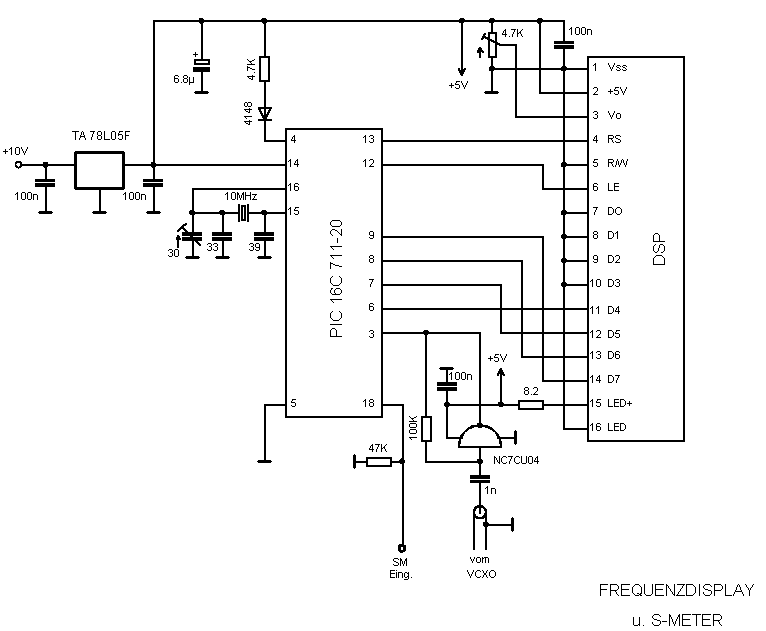 Das Herz der Schaltung ist der Microchip-Controller PIC16C715-20P. Alternativ kann auch auch der PIC16C711-20P verwendet werden. Dieser Controller wurde verwendet, weil er mit 18 Anschlüssen nur wenig Platz verbraucht und gleich einen A/D-Wandler enthält. Der Controller ist nur einmal programmierbar. Er steuert mit seinen Ports den 4-Bit-Datenbus und 3 Steuerleitungen für das Display. Das Display muß kompatibel zum Hitachi-Controller HD44780 sein. Die Ansteuerung und Pinbelegung wird z. B. bei [1], [2] beschrieben. Für die Sandwich-Bauweise muß darauf geachtet werden, daß die Anschlüsse des Displays zur Platine der Ansteuerplatine passen (siehe [4]). Displays mit anderer Anschlußbelegung mit kompatibler Ansteuerung müssen von Hand verdrahtet werden. Der Kontrast des Displays wird mit dem Trimmpoti R1 eingestellt.