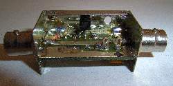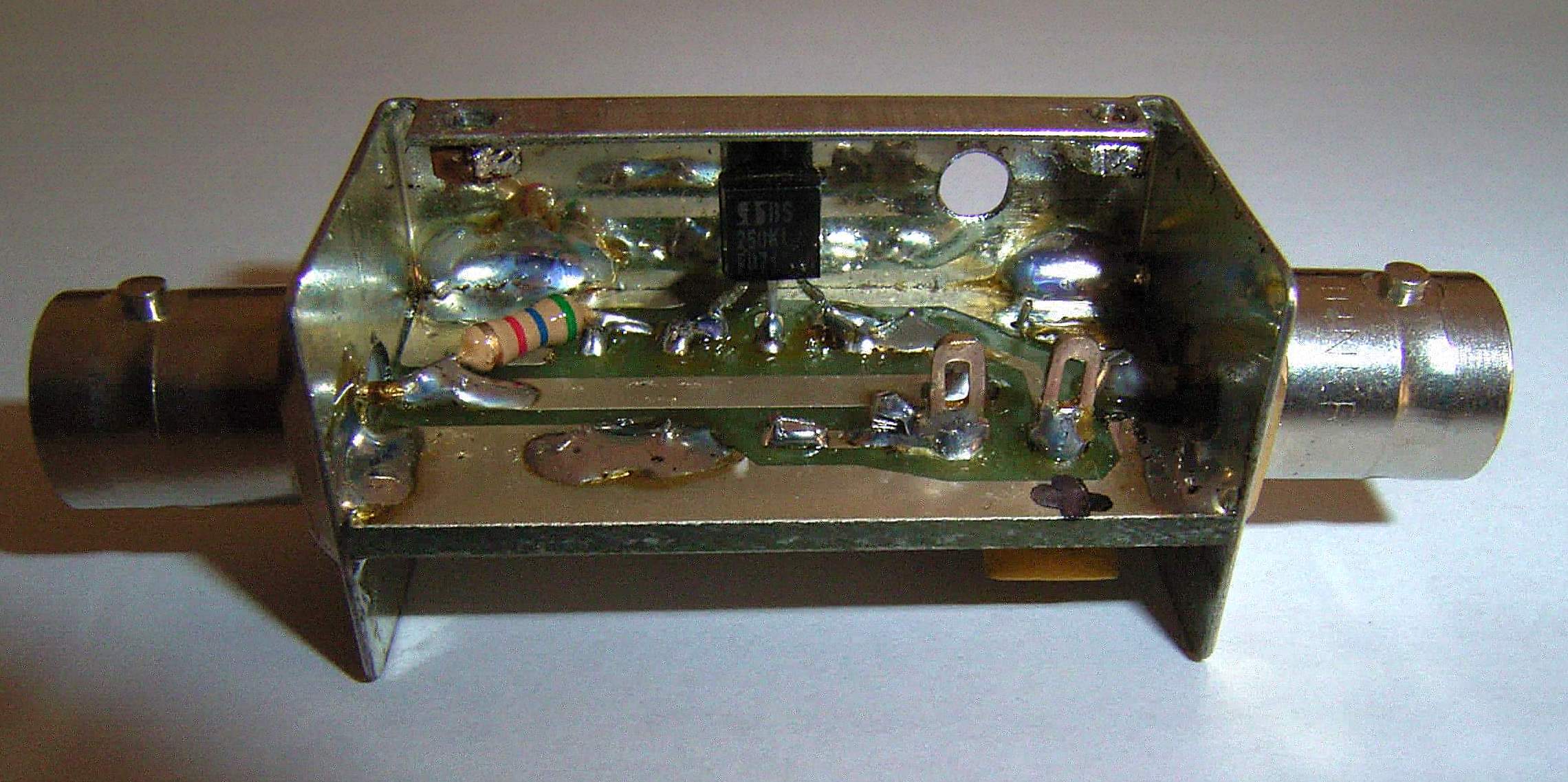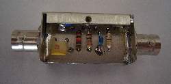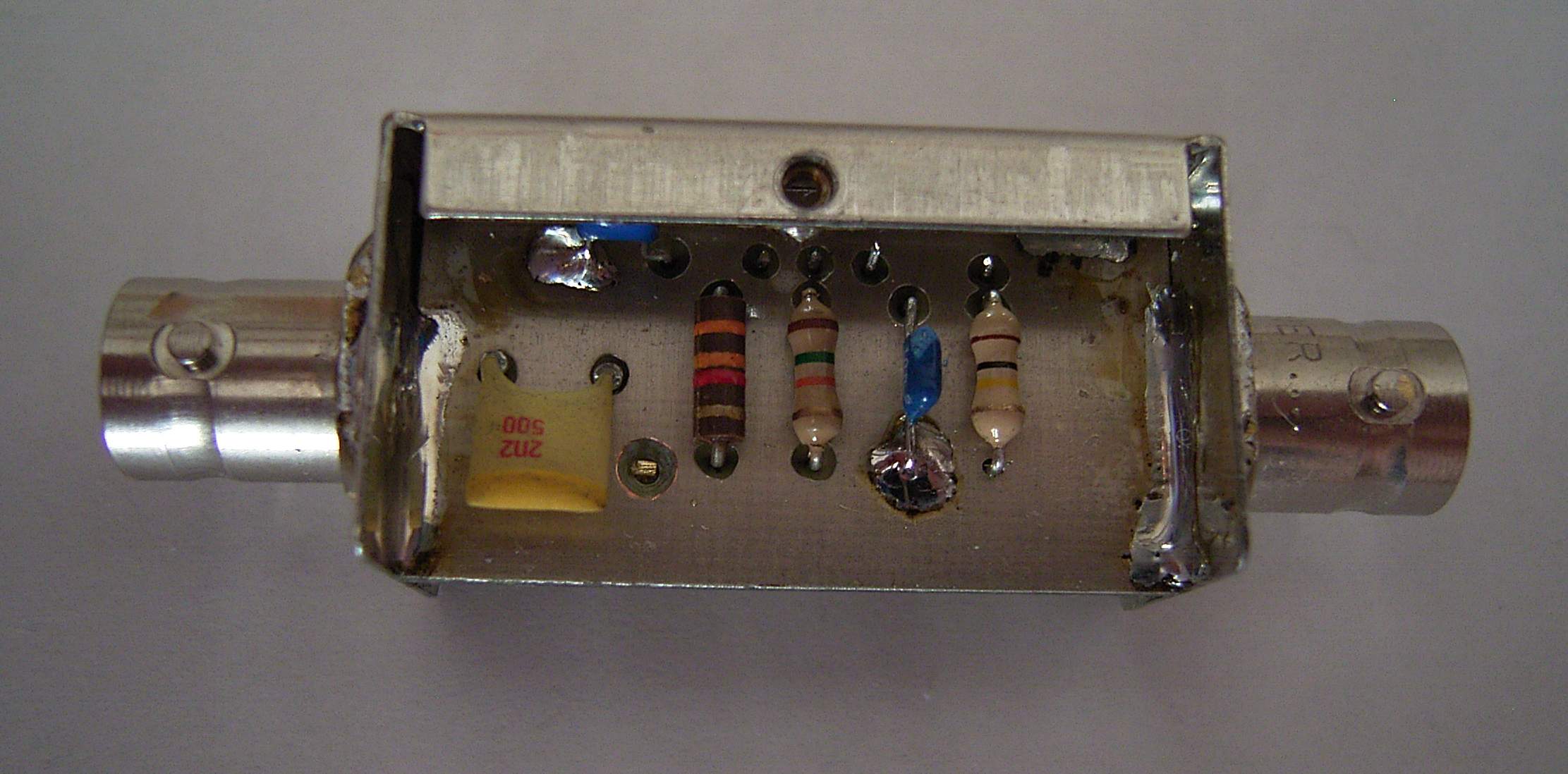 Die nur aus wenigen Bauteilen bestehende Schaltung wird in ein Schubert Filtergehäuse FG 1 aus Weissblech mit den Abmessungen 20 x 20 x 35 mm eingebaut. An dessen beiden Schmalseiten ist je eine BNC-Printbuchse angelötet . Alle Bauteile sind auf einer doppeltkaschierten 34 x 24 mm großen Leiterplatte platziert. Die Unterseite besteht aus einer durchgehenden Massefläche. Deshalb müssen alle Bohrungen der nicht Masse führenden Lötaugen mit einem 3 mm Bohrer freigesenkt werden. Eine 50 Ohm Leiterbahn die durch einen 10nF Keramikkondensator galvanisch getrennt ist, führt von der Eingangs- zur Ausgangs-BNC-Buchse. Sie wird direkt mit den Pins der BNC-Buchsen verlötet. Die obere und untere Massefläche ist an mehreren Stellen mit dem Weißblechgehäuse zu verlöten.